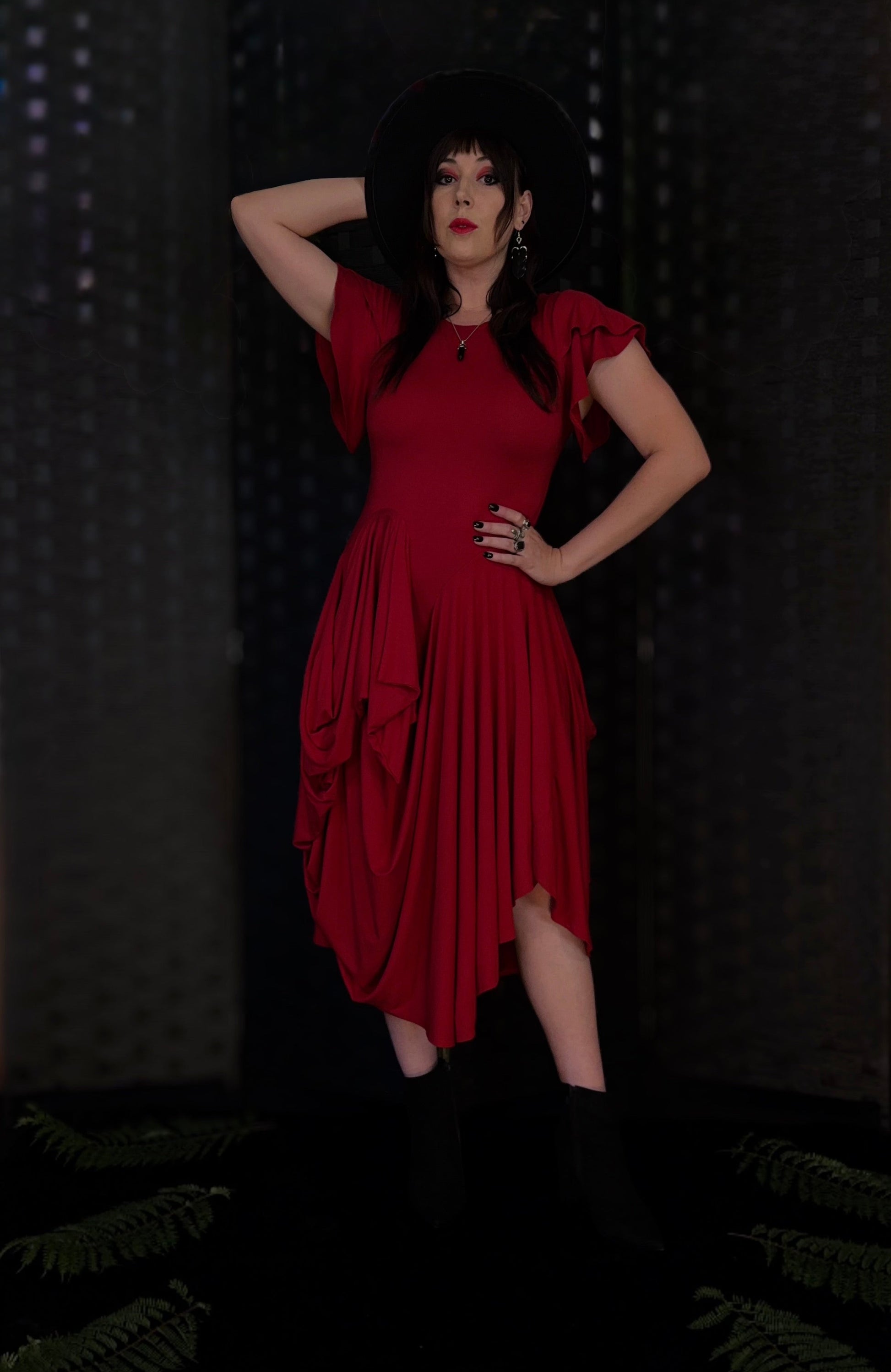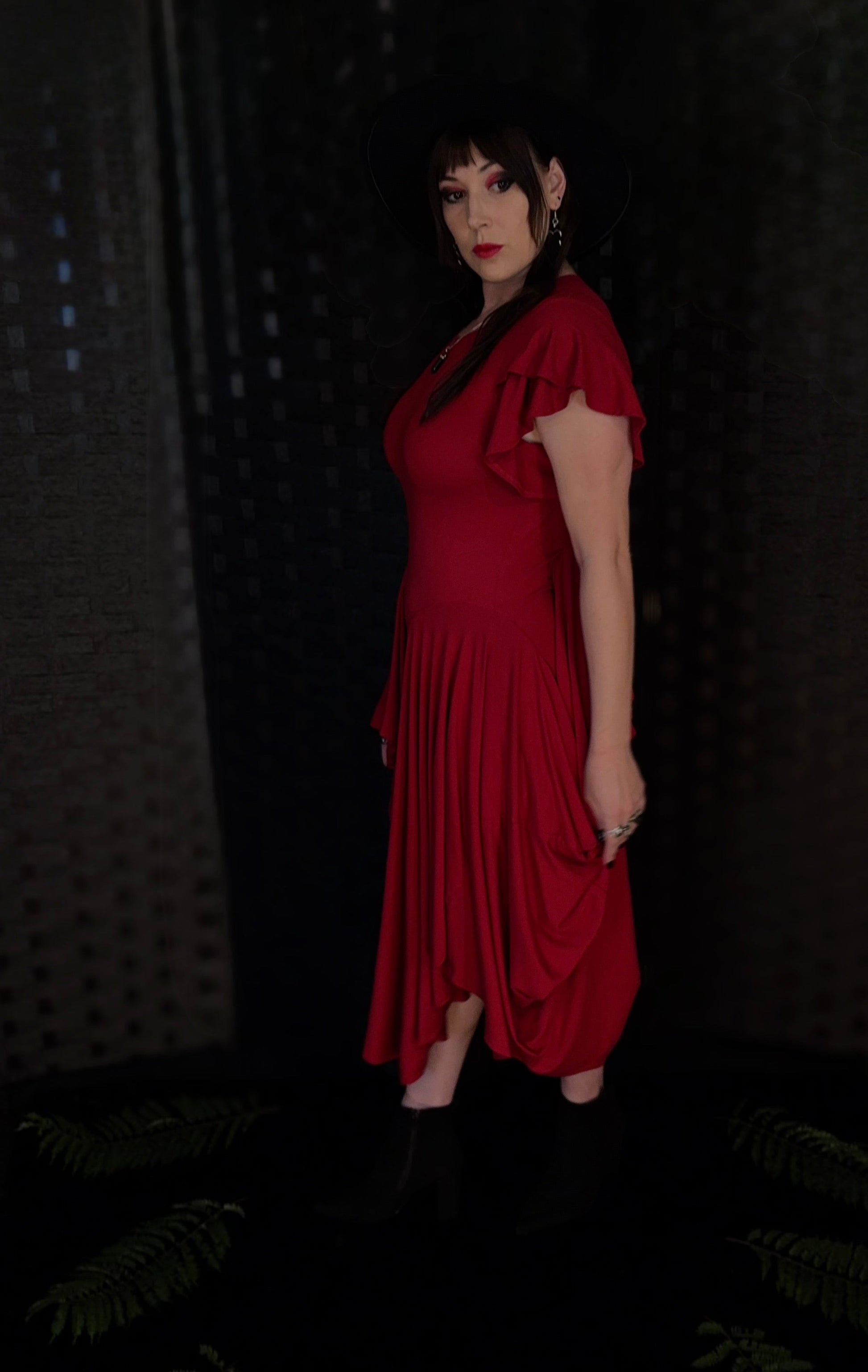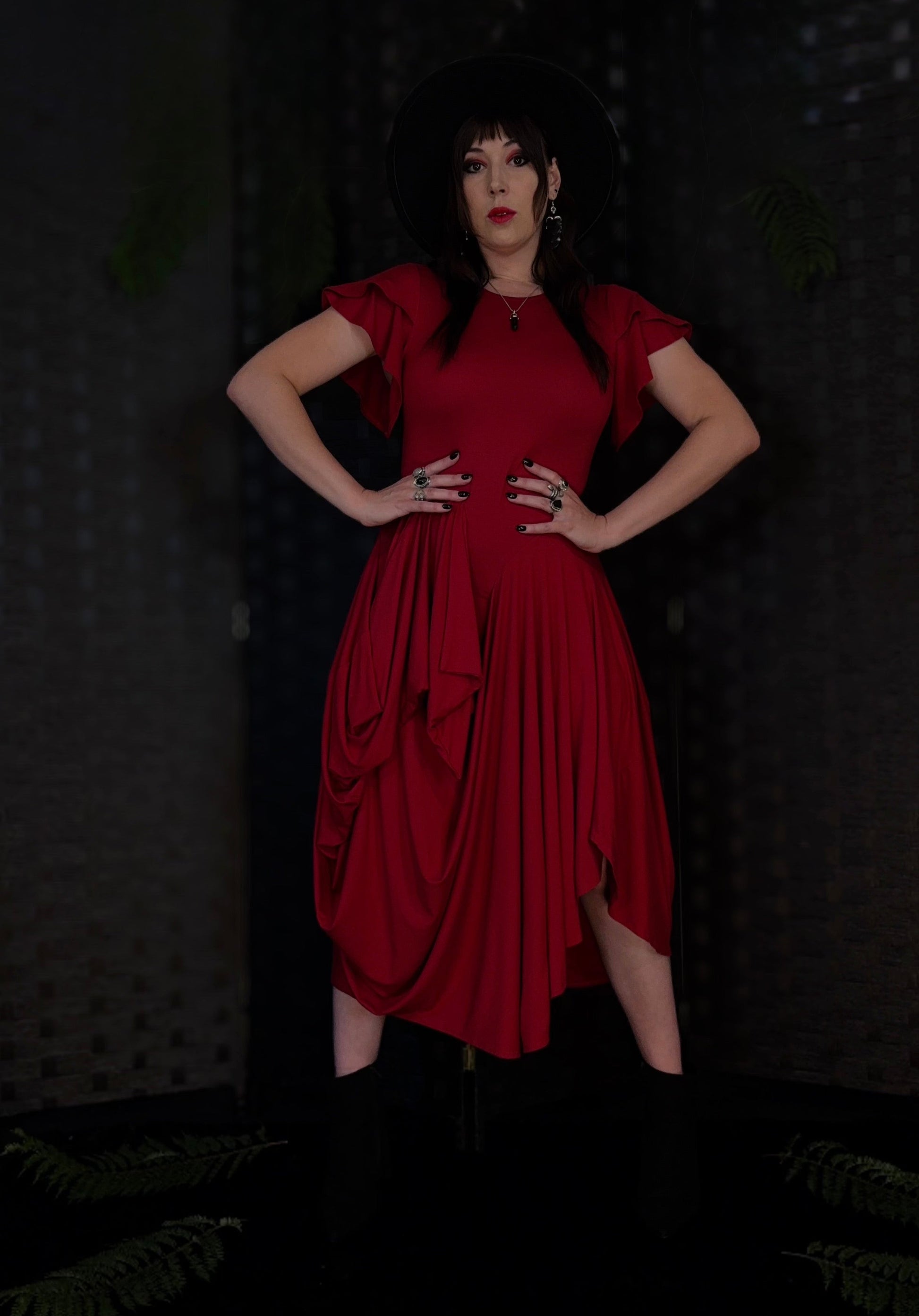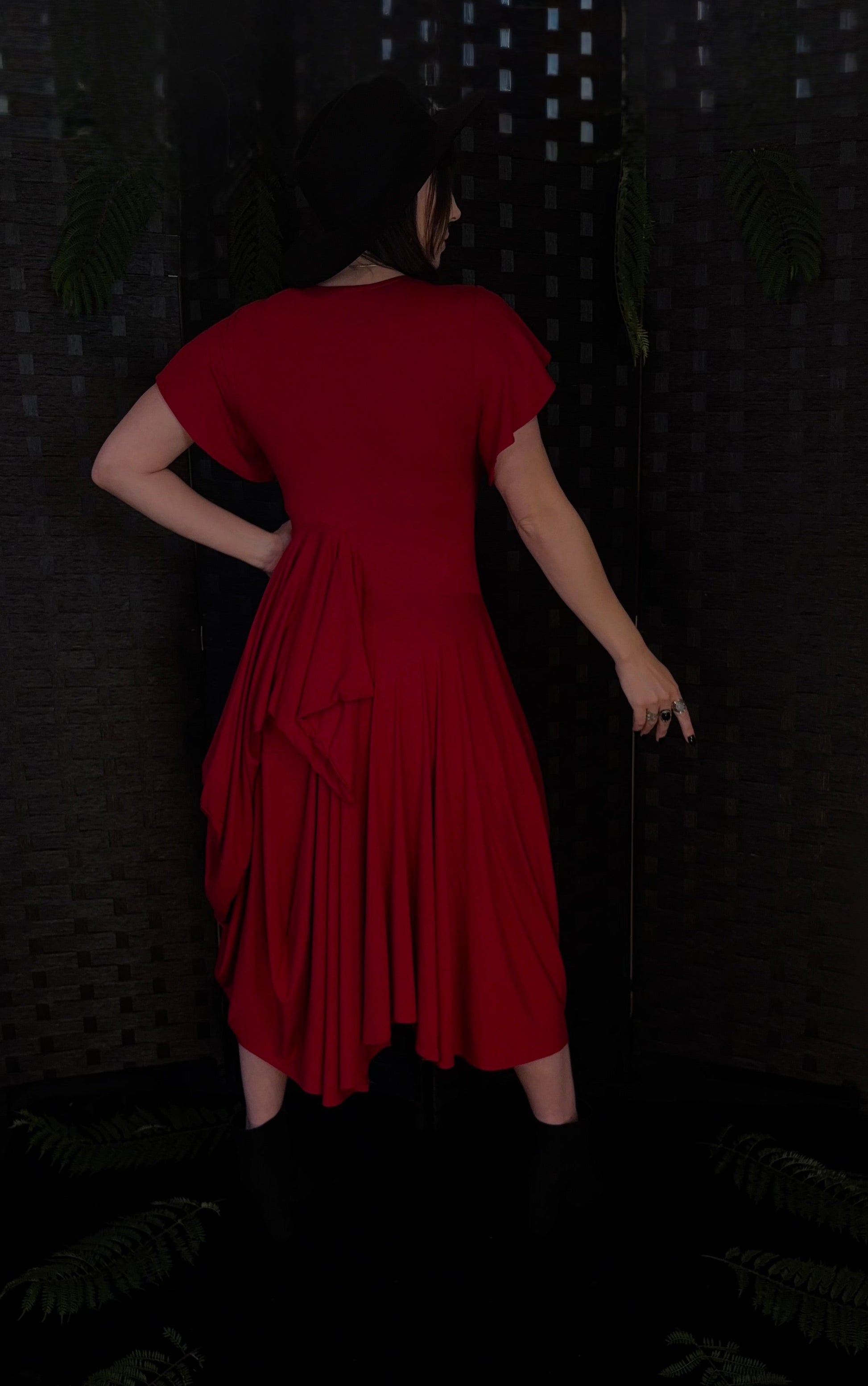 Embrace your inner goddess with this Grecian inspired dress! Both extremely comfortable and stylish, this fluid draping, sculptural dress is a show stopper. Asymmetrically draped midi length dress with a scoop neck and flutter petal sleeves. Fitted through bodice with a voluminous skirt and an irregular hem.